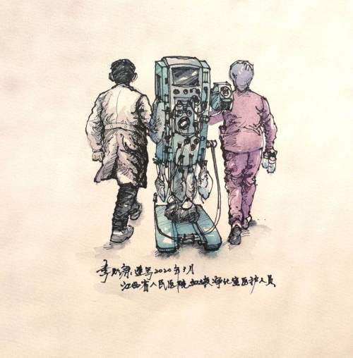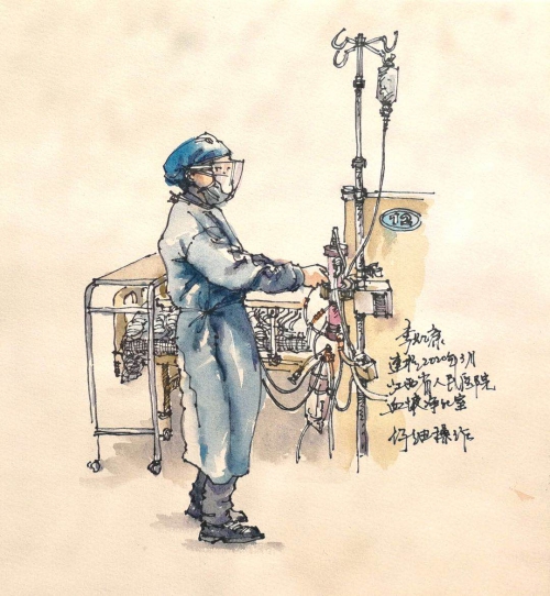 近日,一幅幅速写小画在血透室肾友大家庭群、血透室天使群以及他们的朋友圈“走红”,画的主题是“守候”,描绘了新冠肺炎疫情下的血透室管理故事。