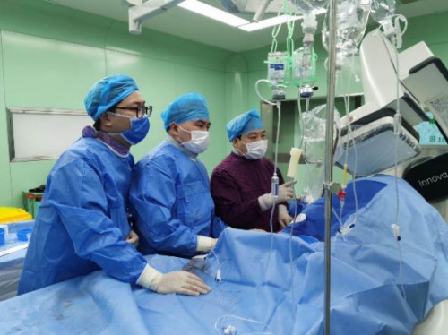 4月16日,我院红谷滩院区二号楼十楼心血管内科三病区(原心内六区)迎来了搬迁后的首位急诊患者。患者王某,在工地务工时突发意识丧失,四肢乏力,被工友送到新建区人民医院抢救,行心电图诊断为急性ST段抬高型下壁心肌梗塞,遂通过胸痛中心绿色通道转至我院。在我院电梯里,患者再次发作意识丧失,接诊医师立即给予胸外心脏按压,快速转运至病房后,给予心脏电除颤,呼吸机辅助呼吸。经过医护团队的积极抢救,患者神智转醒,随即开通绿色通道行急诊手术治疗。术中造影显示患者右冠畸形,造影导管始终无法到位,省医红谷滩院区心内三区负责人唐昱副主任医师凭借丰富的经验,使用左冠指引导管成功造影并完成手术。患者术后病情平稳,未有恶性心律失常再发。