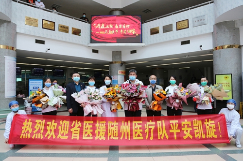 车门缓缓打开,黄清、吴西雅、赖红琳、杨丽兰、傅银娣次第步入门诊大厅,现场响起掌声与欢呼。院领导向黄清等5人献上鲜花,代表全院向圆满完成援助湖北随州抗疫任务的5名勇士表示祝贺,感谢队员们在湖北随州不畏牺牲、辛勤付出,为省医争光。院领导叮嘱工作人员做好归来队员的体检和后勤保障工作,照顾好队员们的心理和家庭,在工作中继续关心医疗队员。