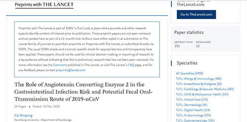 我院心内科洪浪教授团队将新冠肺炎相关成果发表在LANCET杂志预印版平台SSRN,此举破除“唯论文”、“SCI至上”的风气,及时与业界分享最新战疫成果。