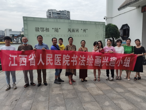 近日,以“赣鄂相‘随’,风雨同‘州’”为主题,弘扬讴歌江西援随医务人员高尚职业精神的书画展在南昌画院举行。8月9日上午,我院书画兴趣小组10余人参观了此次主题展,用眼睛去“发现”启迪思维、愉悦心灵的美。得知我们是医务工作者,南昌画院专门安排青年画家邹霞老师全程介绍和讲解。