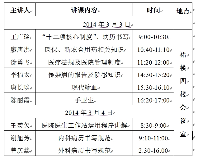 2014年度春季“县级医院骨干医师”、进修生岗前培训安排表
