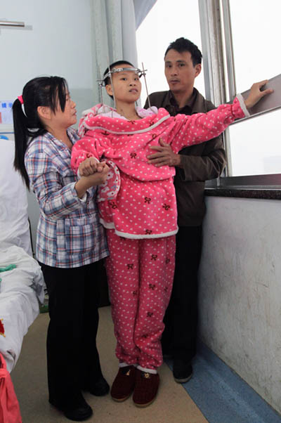 徐云成在头盆环的帮助下,脊柱被人工“撑起”,每隔一段时间,在小女孩身体条件允许地情况下,陈钢博士会为她向上紧一紧螺丝,螺丝每紧一分,脊柱就被拉直一分,长期积累,弯曲如U型的脊柱已经被渐渐拉开。手术前,徐云成和徐妈妈几乎一样高,如今,徐妈妈站直了只达到徐云成的耳朵处。目测,徐云成的身高在1.53米,手术前笔者为她测量的身高为1.43米。