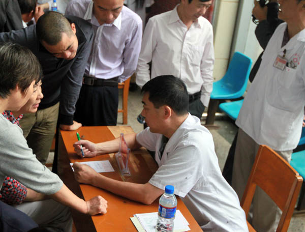 心内科的桌前自始自终都有长长的队伍,不仅仅是老年人前来问诊,不乏40岁左右的青壮年和不谙世事的儿童也在队伍当中。王洪主任医师接诊过程中来不及喝一口水,不停地为病人听心率、测脉搏。很多农村患者来到肖裕华博士的桌前,纷纷拿出X光片,指着自己身体的某个部位述说病情,虽然只能借助自然光线,肖裕华也看得分外仔细,他还亲手教病人做体位锻炼,讲述如何控制病情。贺雅琳主任医师在一个诊室接诊,马上就要在旁边的暗室为病人进行检查,眼科病人队伍排到门外,一个上午她来回跑动数十次,接诊不下40人。