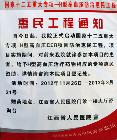 11月26日,江西省人民医院H型高血压防治惠民项目正式启动,本次惠民服务项目专门针对高血压患者人群进行筛查,对H型高血压患者进行赠药服务。