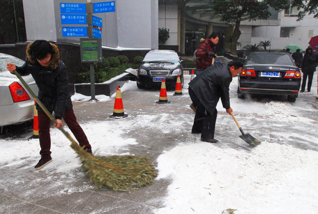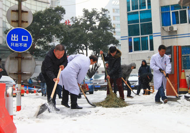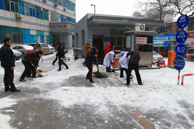 后勤管理科科长胡建新、机关后勤总支书记蒋孝明、保卫科科长孙建阳等同志组织后勤管理科、院办、保卫科、物业管理人员数十人轮番作业,在住院部大门、北门、一部和体检中心门前的主要通道人工除雪。他们利用铁锹、扫把等工具将积雪一点点清除,众人还要一边疏导过往行人、一边引导车辆。风雪吹得大家手和脸通红,但是人人都没有停下手里的工作,努力将风雪带来的危险和不便降到最低。