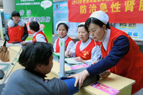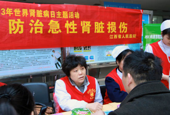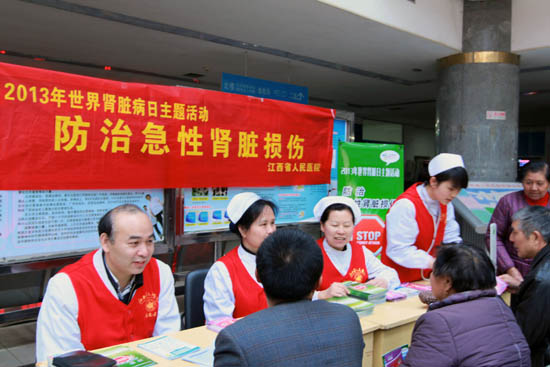 3月14日是第八个世界肾脏病日,本次肾脏日活动主题是“防治急性肾脏损伤”。上午8时,来自我院肾内科的十余名医护志愿者,在门诊大厅开展了大型公益义诊宣传活动,普及肾脏病常识,宣传保护肾脏的重要性,提高人们主动防治慢性肾脏病的意识和知识。