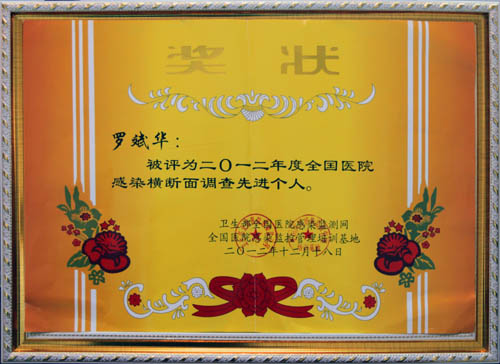 日前,在2012年度全国医院感染横断面调查活动中,我院表现突出,被卫生部全国医院感染监测网及全国医院感染监控管理培训基地评为“2012年度全国医院感染横断面调查组织先进单位”,医院感染管理科罗斌华被评为“2012年度全国医院感染横断面调查先进个人”。