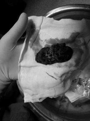 后来,咳嗽时也会感到肺部疼痛,摄片发现胸部有一团阴影,以为是肿瘤,一家人都十分紧张焦虑。4月12日,熊先生来到南昌求医,经人介绍到省人民医院心胸外科就医,徐全主任医师收治了他,4月22日行右肺上页肿物切除术,切出一个鸡蛋大小的肿块,并从肿块中钳出一根长约2cm的鱼刺。