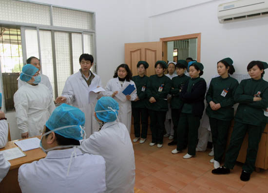 为应对可能出现的“人感染H7N9禽流感”疫情,强化我院医疗救治患者的应急能力。4月24日上午10时,我院组织相关部门开展了“人感染H7N9禽流感”应急演练,对接诊的发热患者由预检分诊点初步筛查、发热门诊进一步诊断、流行病学调查、专家会诊、疫情报告、标本采集、病人转诊、消毒隔离等接诊流程进行了现场演练。