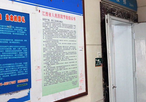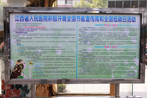一是在门诊候诊大厅悬挂节能宣传横幅“努力创建节约型公共机构示范单位”。二是在住院部大厅悬挂节能宣传横幅“践行节能低碳 建设美丽家园”。三是在门诊设立节能宣传栏。标题:江西省人民医院积极开展全国节能宣传周和全国低碳日活动。以及如何进行节水、节电小常识。四是张贴节能标识,对全院使用的电源及空调开关和水龙头都张贴了节能标识“使用空调 请勿开窗”、“节约能源 从我做起”、“节约每一度电”、“珍惜生命之源 节约每一滴水”。五是利用门诊部和住院部宣传栏张贴“江西省人民医院向全院干部、职工及病友的节能倡议书”。 六是后勤管理科组织水电维修人员,物业工程部进行节能知识培训及学习,传达上级对节能工作的要求。提高节电节水的科学管理技能。七是全院临床各科室,利用工休会,护士长召集病友进行节水节电宣传教育。加强病房管理。切实提高病友对节能工作的重视。提倡节能,反对浪费。共同搞好节能管理。八是院行政办公室编发“节能宣传周活动”短信。向全院科主任、护士长通过网络发送。做到节能工作齐心协力共同抓。