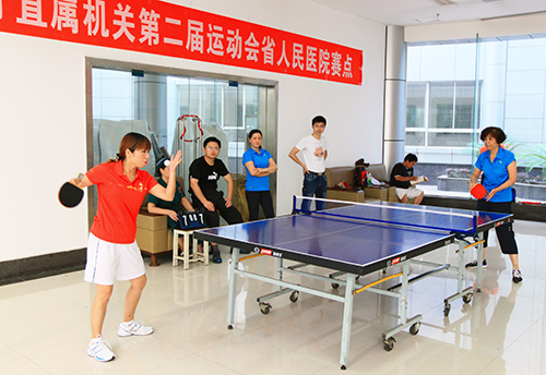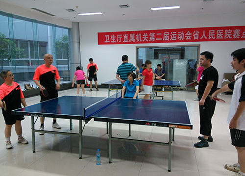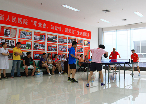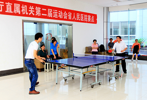 下午3点半,两支客队抵达赛场,经过对练热身,大家熟悉了场地,比赛正式开始。省职防院党委书记郑海坚与省人民医院副院长马健进行了男单对决,同时进行的还有省肿瘤医院与省人民医院的女单比赛,现场观众情绪高涨,一起为运动员们喝彩。许多精彩的拉锯战和技术球带起叫好声不断,“好球!”、“漂亮!”此起彼伏。