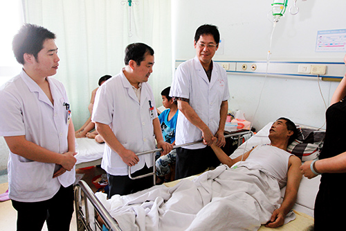当天的手术患者为黑龙江籍68岁老教师,2002年2月因左侧股骨头坏死于东北某著名医院进行了第二代无柄人工全髋关节置换术。术后前7年情况良好,至2009年下楼时捩伤左髋后,出现患髋承重时疼痛及患肢短缩、活动障碍等症状,需拄手杖行走,X线片显示其无柄关节发生了松动下沉现象。董谢平主任接治病人后,通过电子邮件与无柄关节的发明者钱本文教授进行了沟通。适逢钱教授正在大陆讲学,其认真分析了影像资料,发现患者的股骨上端不但没有骨质疏松,而且有骨密度增加现象,已充分显示出无柄关节微应力遮挡的优势,保留了继续用无柄关节翻修的条件,认为仍可并且最好继续用最新型的第五代无柄关节进行翻修。董谢平主任与患者及其家属详细分析病情及各种治疗方案的利弊后,患者欣然接受了钱教授的方案。为确保手术成功,钱教授亲自来到南昌,全程指导了手术的进行,并对患者后续康复治疗提出了建设性的意见。