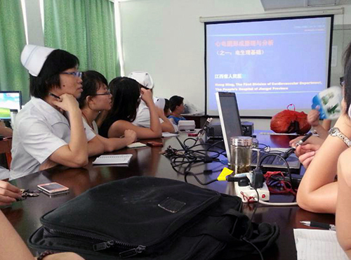 三是鼓励大家做实用性学习。基于优质护理的开展,我科现要求管床护士必须和医生一起查房、学习,了解患者的动态变化,为患者提供满意服务。心内科的查房即是严肃的,丰富多彩的,充满了趣味性。记得有一次查房,我们的主任把心脏的传导系统比如成房子的电路,把心脏上血管比如成房子的水路。心脏“电路”出问题:房室传导阻滞是一种较常见的心脏循环系统疾病。人正常的心脏跳动循环从窦房结开始,窦房结就像发动机,发出“电”冲动,通过心房肌传递,抵达心房再到心室,完成一次心脏收缩“电”活动。发动机故障,即是病态窦房结综合征;“电路”故障,即是传导阻滞。故障发生在心房和心室之间的称为房室传导阻滞。有时听这样生动的讲课,忍俊不禁,笑出声来。在快乐中学习,在学习中快乐着。把理论联系实际,有利于我们记忆和把握知识的要点。