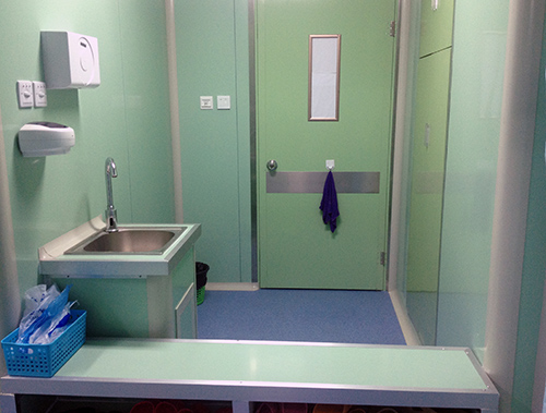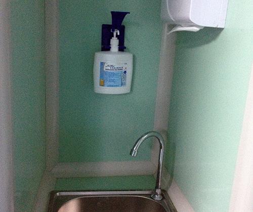 监护室医护人员通道,门口的感应水龙头及手消毒液方便医护人员进出时进行手消毒