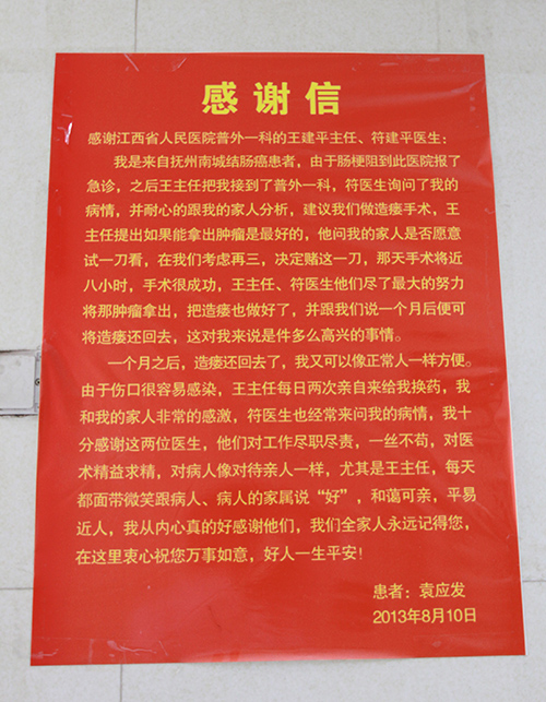 近日,患者已经康复出院,他特意送来一封感谢信,患者袁应发是抚州南城人,由王建平收入院。“王主任提出能拿出肿瘤是最好的,他问我的家人是否愿意试一刀看,在我们考虑再三,决定赌这一刀,那天手术将近8个小时,手术很成功,王主任、符医生他们尽了最大的努力将那肿瘤拿出,把造瘘也做好了,并跟我们说一个月后便可将造瘘还回去,这对我来说是件多么高兴的事情。”
