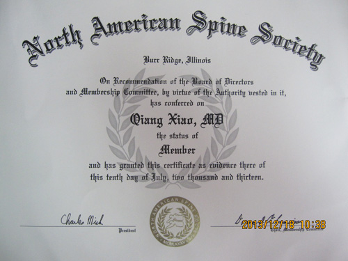 近日,骨二科肖强副主任医师收到来自美国Donna教授、现任北美脊柱外科学会主席亲笔信函:“鉴于Dr.肖在脊柱外科领域的学识和成绩,经北美脊柱外科学会组织讨论同意接收其为正式的学会会员”,并同时寄来了证书。肖强博士是江西省人民医院骨二科首位成为北美脊柱外科学会会员的中青年专家.