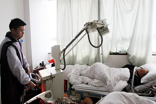 在心内二科病区里,影像科的小伙子们灵活操纵着移动式放射仪器,上门为一名重症患者拍片子,这名患者引起了科室的高度重视,虽然是春节期间,病区按照规定进行了会诊,多名高年资专家来到病床查房。护士长也来到病床前,叮嘱家属的日常护理要点。
