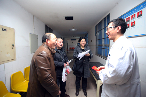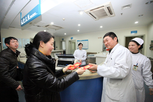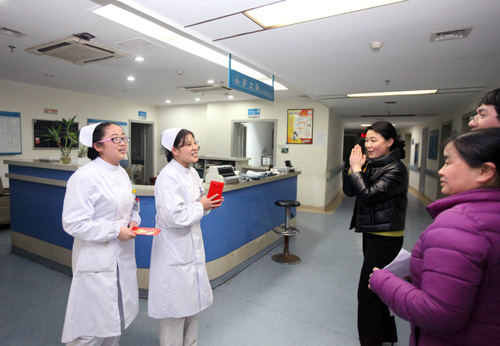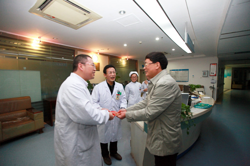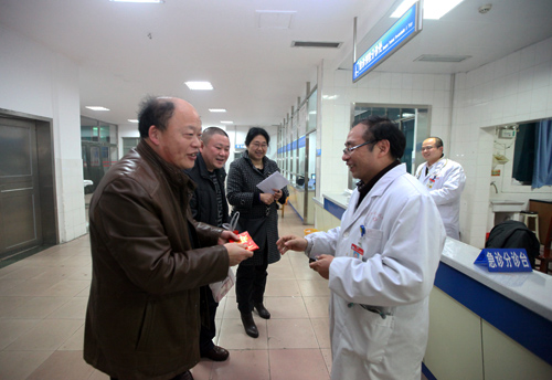 院领导分别带队来到一部、二部、眼科中心大楼、住院部北楼、住院部南楼、门诊医技大楼、食堂、后勤各班组、玉泉岛保健室和远在凤凰洲的120急救中心等处,每到一处,院领导都向值班人员送去新春祝福和慰问金。院领导们向职工拱手作揖,以中华民族最传统的方式,表达祝福之情。“身体健康,万事如意”、“新春大吉,家庭幸福”美好的话语层出不穷,所到之处欢声笑语不断。