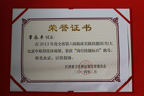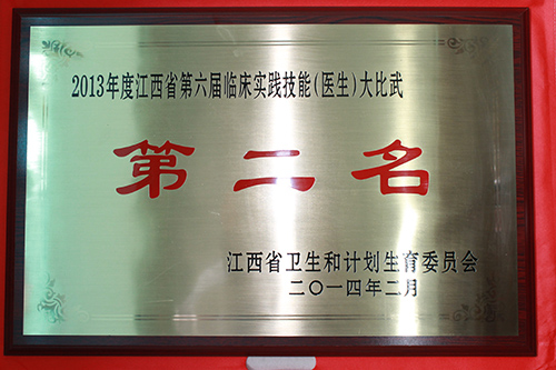 2013年度江西省第六届临床实践技能(医生)大比武优胜单位中,我院获得三级医院第二名,并且是唯一获得该奖项的省级医院。2013年度江西省第六届临床实践技能(医生)大比武“岗位技能标兵”名单中,我院章永平获得产科组三级医院第三名。