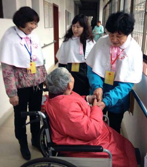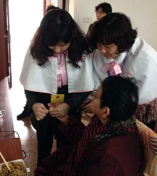 下午3时,志愿者们带着血压计、血糖仪,分成2组,对养老院的66位老人逐个巡诊、为他们量血压、测血糖、健康评估。给长期卧床的老人按摩行预防褥疮护理、根据老人功能缺失的状况,分别给偏瘫肢体进行功能训练;给老人饮食、用药方面的耐心讲解和指导、对他们的健康状态统一登记,还建立失能老人个人档案,便于志愿者们对老人的病情掌握,和延续护理。为了培训一批带不走的老年介护人员,她们还把老年病护理的相关知识手把手传授给养老院的护理员们。她们对我们的爱心行动深表敬意和钦佩。
