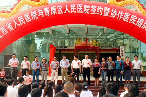 上午8:30,协作医院挂牌仪式开始,省人民医院党委书记雷良华、青原区区长胡小勇、副区长龙新、区卫生局领导、区人民医院领导及省人民医院专家出席。当地医院、政府领导分别在仪式上发表讲话。雷良华做重要讲话,他指出希望通过双方协作关系的建立,带动当地医院的业务水平提升,为病人提供更多优质医疗资源,造福地区百姓。随后,雷良华、胡小勇共同为协作医院揭牌。