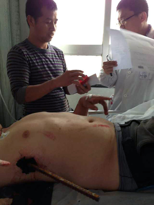 据了解,患者是一名工人,在施工现场从高处坠落,身体扎入地面的钢筋所致。目前正在进一步康复当中。
