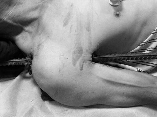 6月29日下午4点左右,63岁的工友赵麻黄,患者于在鄱阳的一个建筑工地做工时,不慎被一根从18层楼高处掉下的,长约6m、直径约14mm螺纹钢砸中右肩胛,钢筋从右肩正上方刺入,腋窝正中传出,两头各露出长约3米左右的螺纹钢。从现场看到,钢筋上锈迹斑驳。在当地消防帮助下短缩两端残留螺纹钢为50cm,患者求诊于当地医院,经医生建议,连夜转上级医院治疗。