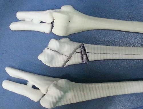 术前一天,董谢平主任在树脂实体模型上预演了肱骨髁上截骨及截骨断端固定钢板的预弯,塑形,固定。截骨平面,截骨角度,截骨方向已了然于心。