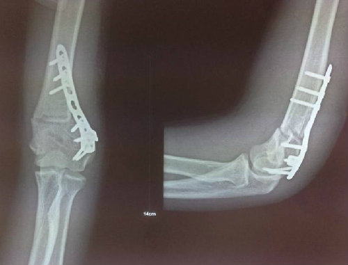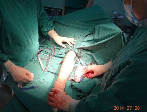 7月8日,由董谢平主任亲自操刀,在漆启华主治医师协助下顺利完成了肱骨髁上的截骨矫形,显露截骨部位,确定截骨角度后行左肱骨髁上外侧楔形截骨,保留内侧皮质完整,闭合外侧截骨面,并造成内侧皮质青枝骨折,钢板行后外侧固定。术中患肘即达到了较好的外观矫形,不但矫正了左肘关节内翻畸形,并让患者肘关节有10度左右的提携角。较以往截骨手术,手术时间大大缩短,出血量明显减少,外观矫形效果较前明显改善。