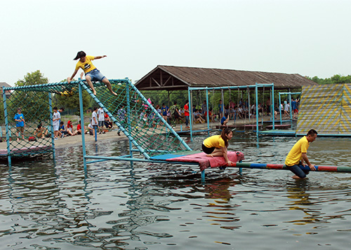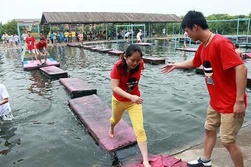 中午的短暂休息后,下午的活动以分组对抗形式进行水上项目竞赛。按照服装颜色,近百名青年分为红、蓝、黄、灰四组,单位时间内通关人数最多的一队获胜。在竞赛中,男女搭配、互帮互助,体现了青年们的蓬勃朝气和健康体魄,我院青年与南铁青年携手共进,发扬团队精神,彼此留下深刻印象。