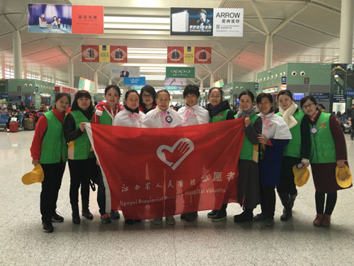 2016年2月24日(正月十六)在护理部主任李素珍、主任助理唐霞珠的带领下,江西省人民医院护理志愿者服务团队一行11人和章金媛爱心奉献团一起来到南昌西站,加入到了一年一度的春运大战中,以“献爱心、助旅客、送健康、保平安”为目标,积极助力南昌西站旅客出行的各种服务。