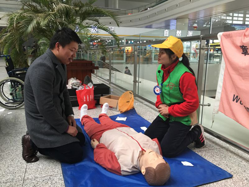 活动一开始,两家单位的志愿者们兵分两组,引导组由穿上绿马甲的两人小分组分散在南昌西站的人流密集处,细心引导旅客进站;宣传组的志愿者们身着白披肩,在候车室摆起来展台,为路过的旅客开展健康知识咨询、宣传和帮助。在24日的一整天里,引导组的志愿者们不顾寒风,站在南昌西站的入口处、车站站前广场等地,主动、热情地为旅客指引方向,以免不熟悉车站情况的旅客提着大包小包走弯路,为他们节约进站时间;在候车室里,志愿者们跟着章金媛主任为陆续前来候车的旅客提供健康咨询和宣讲,不厌其烦地教旅客们做保健操、六步洗手法,并进行心肺复苏现场教学。