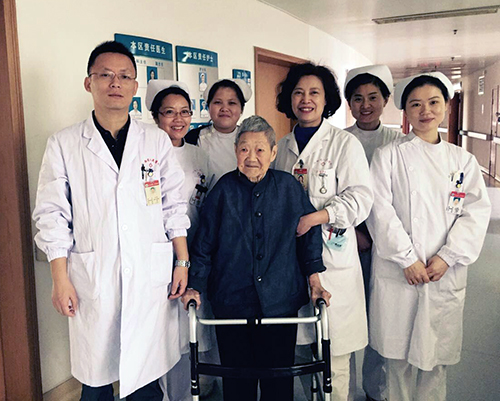 晓明奶奶是2016年2月初由陈钢主任主刀行股骨粗隆骨折内固定术后即入住我科的,为了更好地护理百岁抗战老人,B区护士虚心向骨科护士请教学习,悉心照料老人,循序渐进地为老人进行康复功能锻炼,奶奶在大家的精心照料下由卧床过渡到轮椅直到现在的独自爬一层楼。