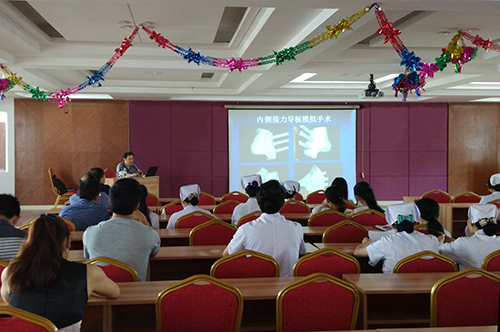 随后我院骨科专家董谢平、袁中平一行到广昌县人民医院骨科病房进行查房,并开展手术和学术讲座。对一名第一腰椎骨折内固定后1年又发生第四腰椎滑脱症的病人,董谢平仅用3个小时,就以常规手术器械进行了微创复位和椎体间融合术,同时取出了上腰椎的内固定物。袁中平为一名腓总神经卡压综合征的患者进行了探查松解手术。