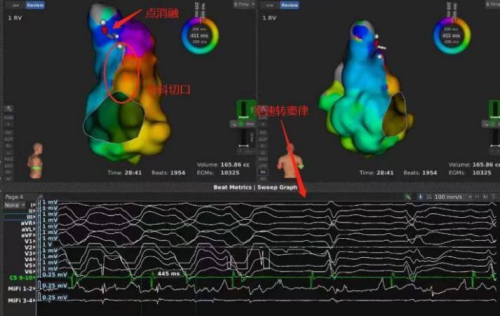 在完善了术前的系列检查后,于11月25日给患者安排手术,由方雁博士主刀,手术经左右股静脉穿刺,使用标测系统建立右室及右室流出道模型,经超高密度标测出,为手术切口相关的室性心动过速,在折返峡部一点转复。整个手术过程不过1.5小时,手术顺利,患者返回病房后只需卧床休息12小时即可下床活动。当得知手术成功后,患者一颗悬着的心也放下了,露出开心的笑容,并衷心地感谢省医心内科心律失常团队使他重燃生命的希望。
