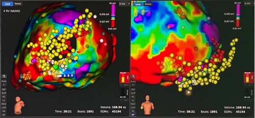 经过充分的术前讨论,2021年2月1日,在赖珩莉指导下,方雁主刀顺利为患者完成“干性心包穿刺”,随后使用Rhythmia Orion导管依次对左心室内膜、右心室内膜和心室外膜进行全心标测,标测发现与术前预想相似,患者心室内膜只存在少量疤痕,但在心室外膜基本上全部被疤痕覆盖,而经由非常艰难的长时间、多种方法的标测,最终确认室速来源于左室心尖部,整个手术过程从早晨8:30持续到下午17:30,在左室心尖部内、外膜分别消融后室速立即终止,再次诱发未再发生室速,这也让神经高度紧张和极度疲惫的手术医生长长舒了一口气。