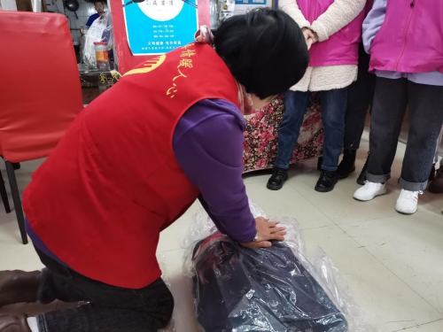 随后,志愿者何青松开始了她的讲课,通俗易懂的课程让在座的各位逐渐了解到日常急救常识。特别是讲解到海姆立克急救法这一环节时,志愿者赖丽芳来到台前,进行急救的动作演示以及注意事项。