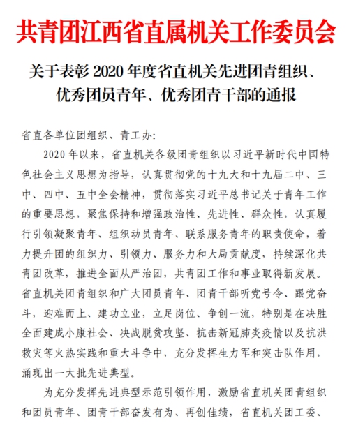 为深入学习贯彻习近平新时代中国特色社会主义思想和党的十九大精神,学习贯彻习近平总书记关于青年工作的重要思想,集中展示新时代省直机关青年的良好精神面貌和崇高价值追求, 激励青年勇挑重担、奋发作为,为奋力谱写全面建设社会主义现代化国家江西篇章贡献青春力量,近日,省直机关团工委、省直机关青联评选了一批省直优秀共青团员、团干,我院骨科罗琼清获省直优秀共青团员荣誉称号。