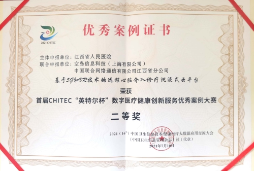 2021年7月9日下午,以“让健康中国插上数字翅膀--构建数字健康双轮驱动新发展格局”为主题的首届CHITEC数字医疗健康创新服务优秀案例大赛现场决赛在湖北武汉召开。江西省人民医院信息处刘东丽代表医院进行现场决赛,最终,由江西省人民医院、空岛信息科技(上海有限公司)、中国联合网络通信有限公司江西省分公司联合申报的《基于5G和VR技术的远程心脏介入诊疗沉浸式云平台》,荣获首届CHITEC“英特尔杯”数字医疗健康创新服务优秀案例大赛二等奖。