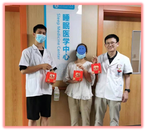 原来,王女士(化名)的儿子小刘(化名)在2020年上半年读高二时常常出现日间嗜睡症状,每天上课都打瞌睡,经常犯困,以为是学习劳累、夜间睡眠不足导致,当时并未引起注意。直到2021年,小刘仍然存在课堂上瞌睡的症状,严重时考场上也会瞌睡,不能自控,遂于今年年初到我院红谷滩院区神经内科的睡眠医学中心就诊。经过一系列的检查明确诊断为发作性睡病,神经内科睡眠医学中心的专家精心制定治疗计划,通过重复经颅磁刺激(rTMS)等物理治疗,小刘的日间嗜睡情况得到明显控制,在今年整个高考过程中,小刘在考场上都没有发生瞌睡,并且发挥出色,如今考上了心仪的大学。在奔赴大学前,小刘的母亲特意到神经内科睡眠医学中心,为姚栋元团队送来“金榜题名”的“喜糖”,以表达对省医睡眠医学团队的感激之情。