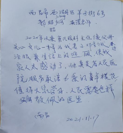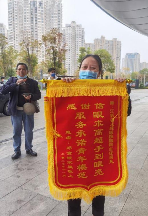 锣鼓喧天,笑脸盈盈,这不是庙会或庆典,而是患者家属对医生的一种特殊感谢方式。11月17日上午,江西省人民医院(南昌医学院第一附属医院、南昌大学附属人民医院)红谷滩院区门诊大楼欢快的敲锣声吸引了周围群众的注意,西湖区羊子街的患者家属郭昭炯敲锣打鼓为我院眼科医生肖凡送来“眼术高超手到眼亮、服务承诺青年模范”的一面锦旗和一封表扬信,表达其感激之情。