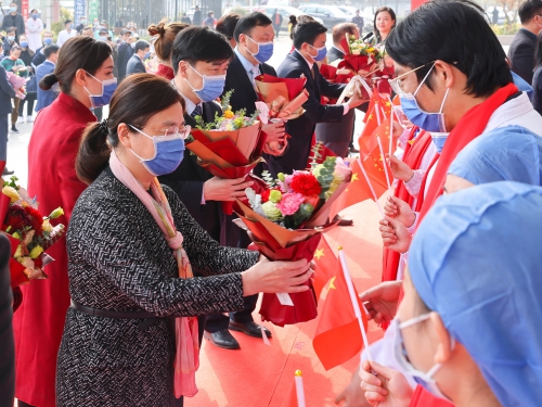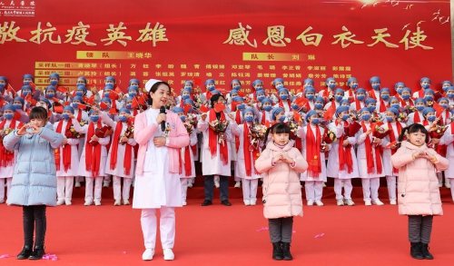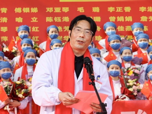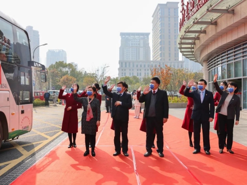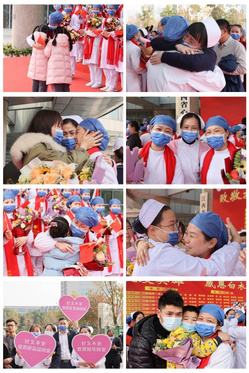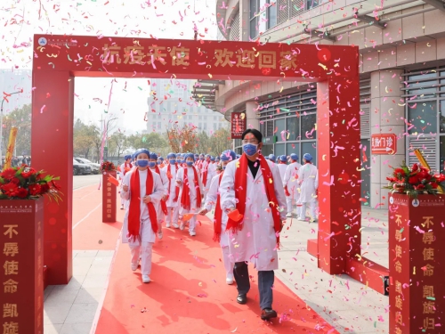在同事和亲友们期盼与激动的目光下,2辆大巴缓缓停靠,面带胜利微笑与回家喜悦的战疫天使们有序下车,步上礼台,现场掌声雷动。院领导和中层干部第一时间为队员们献上鲜花,热烈欢迎抗疫英雄凯旋。