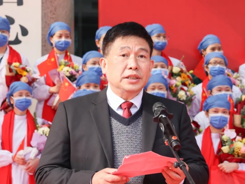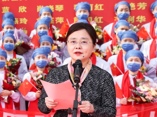省卫健委党组成员、院党委书记钭方芳,院长陈志平,全体在家院领导,医务人员代表、队员家属200余人庄严列队。