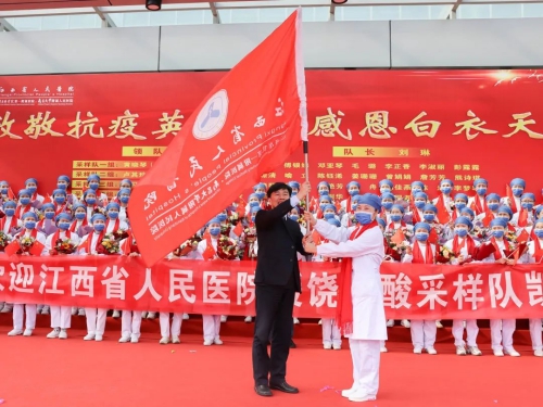 使命复,旌旗归。院长陈志平郑重地从采样队队长、护理部主任刘琳手中接过在上饶战疫中久经淬炼的院旗,他向领队、队长及全体队员致敬、慰问和感谢。他指出,队员们闻令而动,逆行出征,不负重托,在上饶尽显了省人民医院的担当和责任。