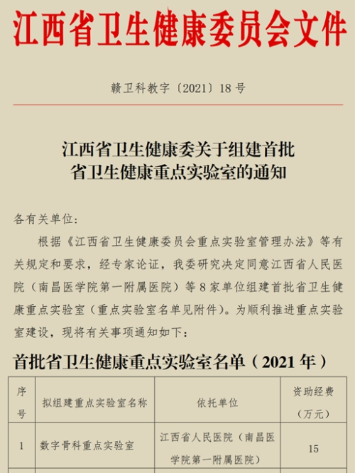 2021年岁末,江西省卫生健康重点实验室首批组建名单公布,由江西省人民医院(南昌医学院第一附属医院、南昌大学附属人民医院)申请组建的数字骨科重点实验室成功入选。