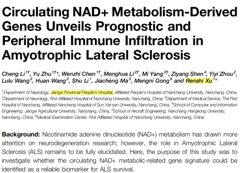 近日,江西省人民医院党委委员、南昌医学院临床医学院副院长、神经内科徐仁伵教授作为通讯作者撰写的“Circulating NAD+ Metabolism-Derived Genes Unveils Prognostic and Peripheral Immune Infiltration in Amyotrophic Lateral Sclerosis”一文以原创性研究论著的形式在细胞生物科学的国际权威期刊《frontiers in Cell and Developmental Biology》发表,影响因子6.684。