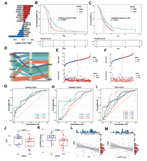 这项研究基于454名肌萎缩侧索硬化(ALS)患者外周全血转录数据,通过机器学习和生物信息学方法构建烟酰胺腺嘌呤二核苷酸(NAD)代谢基因的预后风险评分和预测模型,并评估风险评分与外周免疫的联系。研究发现NAD代谢基因在ALS患者全血中表达异常,基于NAD代谢基因的表达进行一致性聚类分析可识别ALS患者的预后差异。采用机器学习算法筛选NAD代谢基因构建预后风险评分。高风险评分的ALS患者展示了全血NAD代谢的耗竭和更差的生存状况。此外,风险评分与ALS患者全血中CD4幼稚T细胞、CD8 T细胞、中性粒细胞和巨噬细胞的浸润水平密切相关。NAD代谢基因构建的预后风险模型具有较好的预测能力。该研究首次发现外周血中NAD代谢风险评分是预测ALS患者临床结局的有效预测指标,有利于患者的个体化管理和精准化治疗。这项研究展示了江西省人民医院神经内科徐仁伵团队在肌萎缩侧索硬化领域与国际著名专家们走在同列,团队还将开展深入研究,最终将研究成果运用于临床,造福于肌萎缩侧索硬化患者。