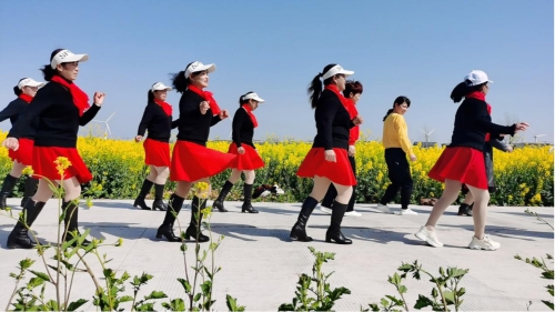 另一边,在一望无际的油菜花海中,村民们正在欣赏舞蹈队带来的舞蹈,在驻村工作队和村“两委”的组织下,前来观看的广大村民也纷纷加入舞蹈队,随着音乐,踏着节拍,像金灿灿的油菜花一样在和煦春风中载歌载舞,他们脸上洋溢着灿烂的笑容,一同享受节日带来的喜悦。巾帼风采与初春美景相得益彰,为七彩油菜花海增添一道靓丽的风景线。