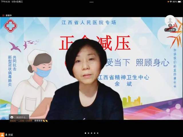 为帮助江西省人民医院(南昌医学院第一附属医院)援吉医疗队队员缓解抗疫期间因高压环境、繁重治疗任务导致的焦虑、烦躁、失眠等情绪和行为问题,院团委(医务社工部)、心身医学科携手江西省心理咨询师协会一同为抗疫医护人员开展人文心理关怀。2022年5月4日,特邀请江西省精神卫生中心副院长余斌为援吉医疗队全体队员开展正念减压专场讲座。